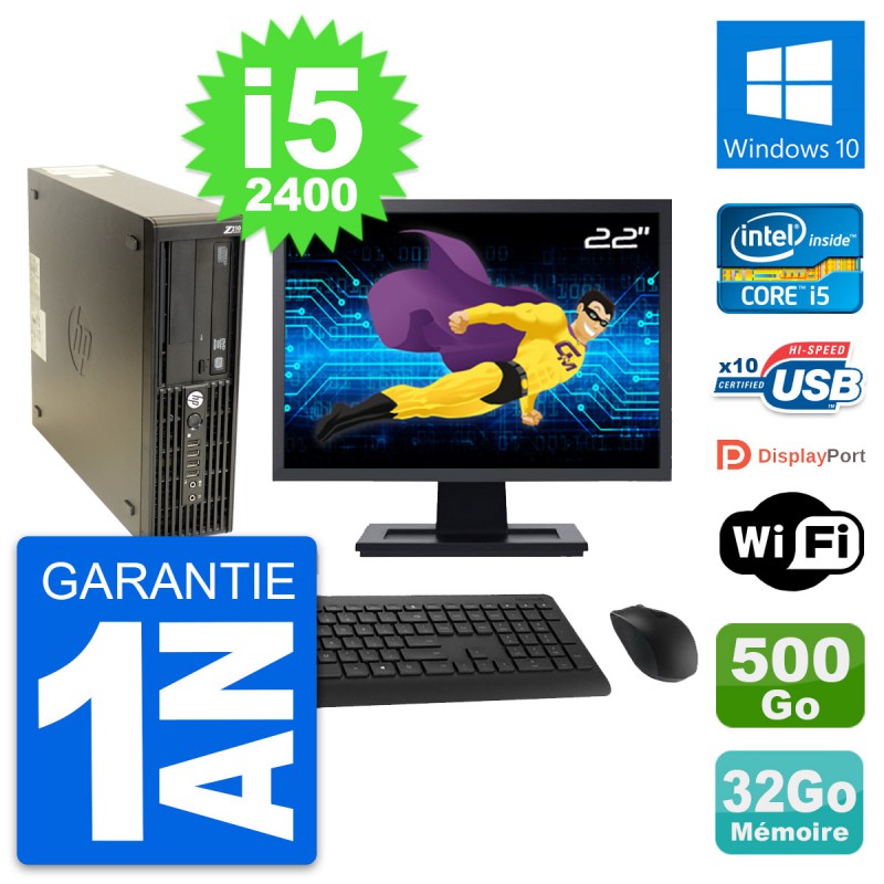 PC HP Z210 SFF Ecran 22" Intel i5-2400 RAM 32Go Disque 500Go Windows 10 Wifi