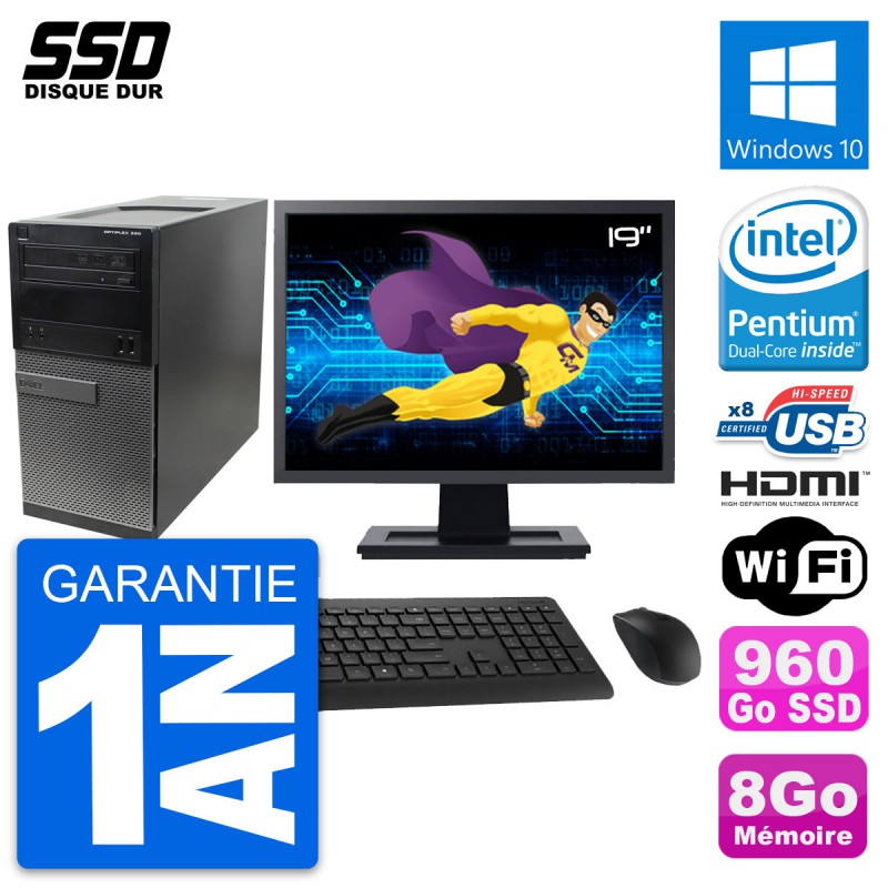 PC Tour Dell 390 - Intel Pentium Dual-Core G630 2.7 Ghz (3 Mo) - 8 Go DDR3 - Disque Dur SSD 960 Go - Graveur DVD - Clef Wifi USB - Windows 10 - Livré avec Ecran 19" + clavier + souris (Marques et modèles variables) - Garantie 1 an.