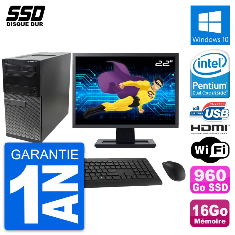 PC Tour Dell 390 - Intel Pentium Dual-Core G630 2.7 Ghz (3 Mo) - 16 Go DDR3 - Disque Dur SSD 960 Go - Graveur DVD - Clef Wifi USB - Windows 10 - Livré avec Ecran 22" + clavier + souris (Marques et modèles variables) - Garantie 1 an.