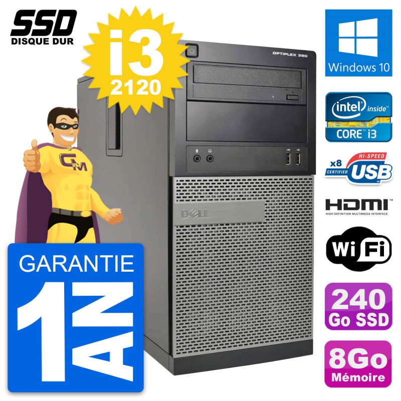 PC Tour Dell OptiPlex 390 - Intel Core i3-2120 3.3 Ghz (3 Mo) - 8 Go DDR3 - Disque Dur SSD 240 Go - Graveur DVD - Clef Wifi USB - Windows 10 - Garantie 1 an.