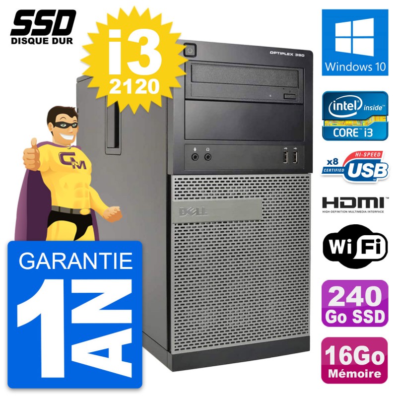 PC Tour Dell OptiPlex 390 - Intel Core i3-2120 3.3 Ghz (3 Mo) - 16 Go DDR3 - Disque Dur SSD 240 Go - Graveur DVD - Clef Wifi USB - Windows 10 - Garantie 1 an.