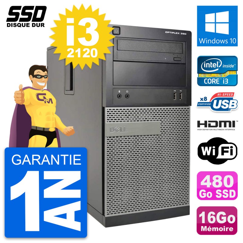 PC Tour Dell OptiPlex 390 MT i3-2120 RAM 16Go SSD 480Go HDMI Windows 10 Wifi