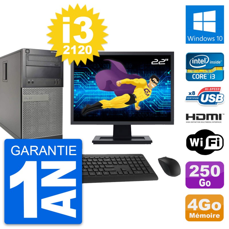 PC Tour Dell 390 - Intel Core i3-2120 3.3 Ghz (3 Mo) - 4 Go DDR3 - Disque Dur 3,5" 250 Go - Graveur DVD - Clef Wifi USB - Windows 10 - Livré avec Ecran 22" + clavier + souris (Marques et modèles variables) - Garantie 1 an.