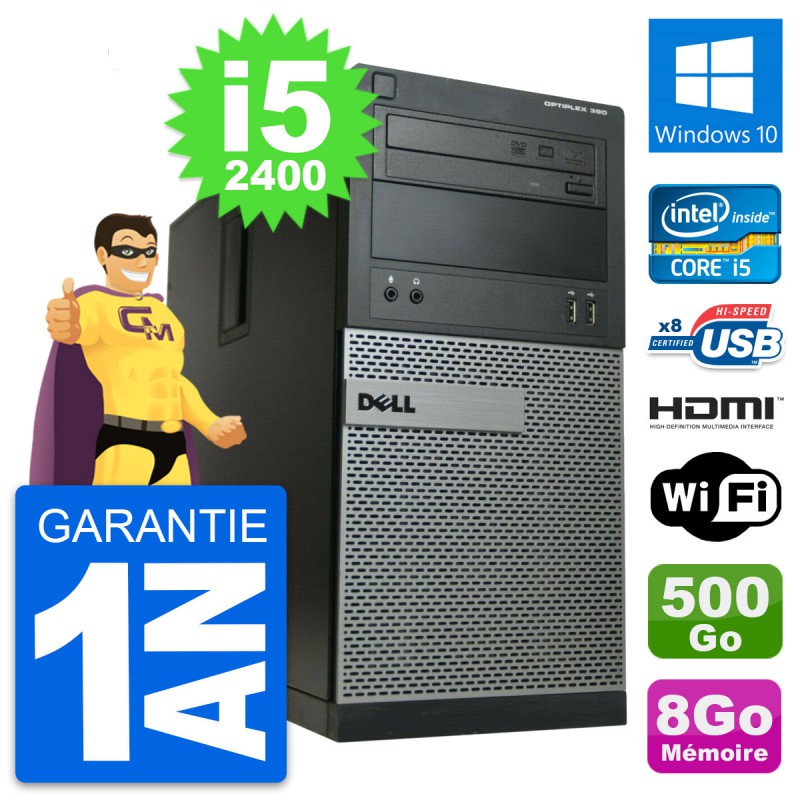 PC Tour Dell OptiPlex 390 - Intel Core i5-2400 3.1 Ghz (6 Mo) - 8 Go DDR3 - Disque Dur 3,5" 500 Go - Graveur DVD - Clef Wifi USB - Windows 10 - Garantie 1 an.