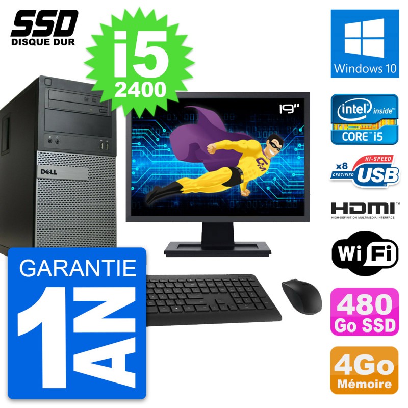 PC Tour Dell 390 - Intel Core i5-2400 3.1 Ghz (6 Mo) - 4 Go DDR3 - Disque Dur SSD 480 Go - Graveur DVD - Clef Wifi USB - Windows 10 - Livré avec Ecran 19" + clavier + souris (Marques et modèles variables) - Garantie 1 an.