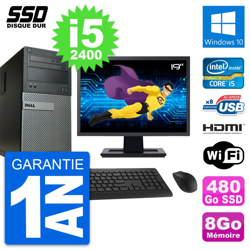 PC Tour Dell 390 - Intel Core i5-2400 3.1 Ghz (6 Mo) - 8 Go DDR3 - Disque Dur SSD 480 Go - Graveur DVD - Clef Wifi USB - Windows 10 - Livré avec Ecran 19" + clavier + souris (Marques et modèles variables) - Garantie 1 an.