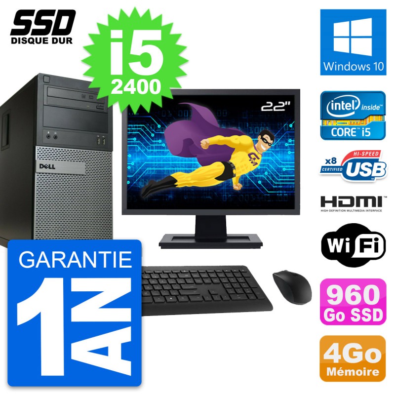 PC Tour Dell 390 - Intel Core i5-2400 3.1 Ghz (6 Mo) - 4 Go DDR3 - Disque Dur SSD 960 Go - Graveur DVD - Clef Wifi USB - Windows 10 - Livré avec Ecran 22" + clavier + souris (Marques et modèles variables) - Garantie 1 an.