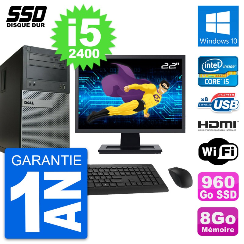 PC Tour Dell 390 - Intel Core i5-2400 3.1 Ghz (6 Mo) - 8 Go DDR3 - Disque Dur SSD 960 Go - Graveur DVD - Clef Wifi USB - Windows 10 - Livré avec Ecran 22" + clavier + souris (Marques et modèles variables) - Garantie 1 an.