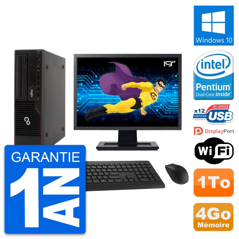 PC Fujitsu E910 DT - Intel Pentium Dual-Core G630 2.7 Ghz (3 Mo) - 4 Go DDR3 - Disque Dur 3,5" 1 To - Graveur DVD - Clef Wifi USB - Windows 10 - Livré avec Ecran 19" + clavier + souris (Marques et modèles variables) - Garantie 1 an.