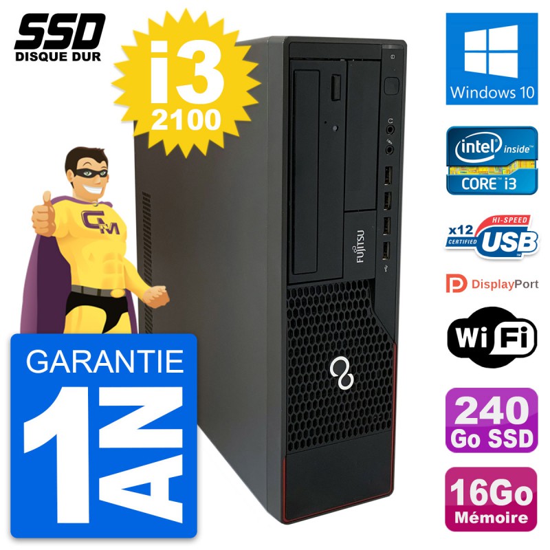 PC Fujitsu Esprimo E910 DT - Intel Core i3-2100 3.1 Ghz (3 Mo) - 16 Go DDR3 - Disque Dur SSD 240 Go - Graveur DVD - Clef Wifi USB - Windows 10 - Garantie 1 an.