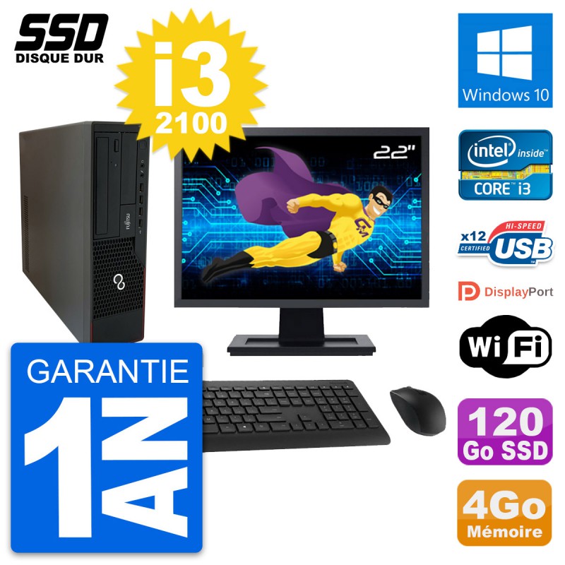 PC Fujitsu E910 DT - Intel Core i3-2100 3.1 Ghz (3 Mo) - 4 Go DDR3 - Disque Dur SSD 120 Go - Graveur DVD - Clef Wifi USB - Windows 10 - Livré avec Ecran 22" + clavier + souris (Marques et modèles variables) - Garantie 1 an.