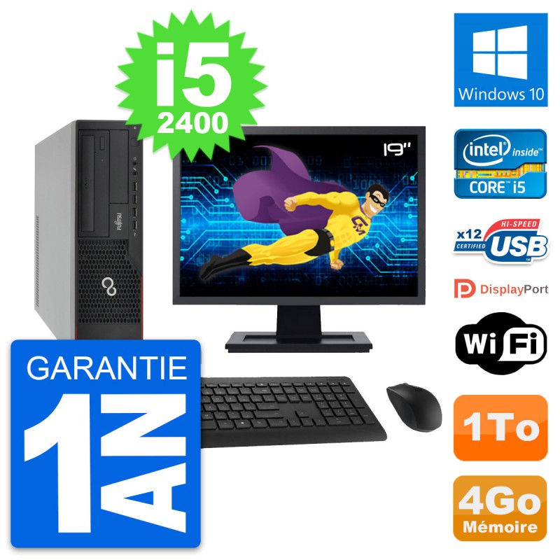PC Fujitsu E910 DT - Intel Core i5-2400 3.1 Ghz (6 Mo) - 4 Go DDR3 - Disque Dur 3,5" 1 To - Graveur DVD - Clef Wifi USB - Windows 10 - Livré avec Ecran 19" + clavier + souris (Marques et modèles variables) - Garantie 1 an.