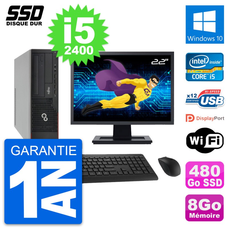PC Fujitsu E910 DT - Intel Core i5-2400 3.1 Ghz (6 Mo) - 8 Go DDR3 - Disque Dur SSD 480 Go - Graveur DVD - Clef Wifi USB - Windows 10 - Livré avec Ecran 22" + clavier + souris (Marques et modèles variables) - Garantie 1 an.