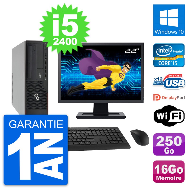 PC Fujitsu E910 DT - Intel Core i5-2400 3.1 Ghz (6 Mo) - 16 Go DDR3 - Disque Dur 3,5" 250 Go - Graveur DVD - Clef Wifi USB - Windows 10 - Livré avec Ecran 22" + clavier + souris (Marques et modèles variables) - Garantie 1 an.