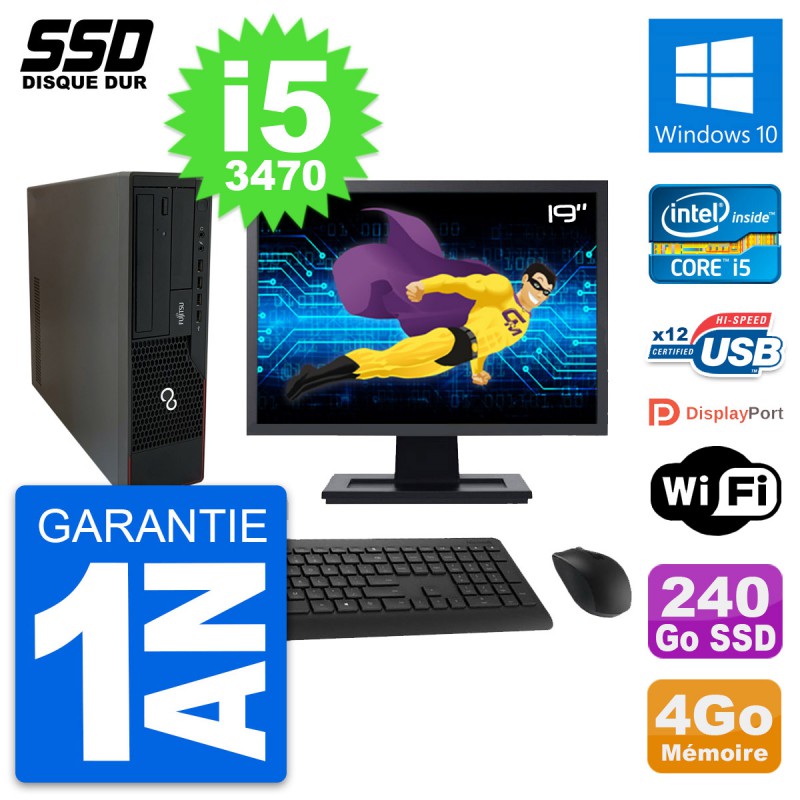 PC Fujitsu E910 DT - Intel Core i5-3470 3.2 Ghz (6 Mo) - 4 Go DDR3 - Disque Dur SSD 240 Go - Graveur DVD - Clef Wifi USB - Windows 10 - Livré avec Ecran 19" + clavier + souris (Marques et modèles variables) - Garantie 1 an.