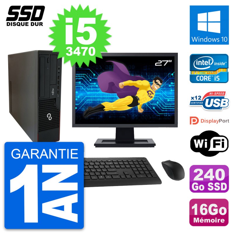 PC Fujitsu E910 DT - Intel Core i5-3470 3.2 Ghz (6 Mo) - 16 Go DDR3 - Disque Dur SSD 240 Go - Graveur DVD - Clef Wifi USB - Windows 10 - Livré avec Ecran 27" + clavier + souris (Marques et modèles variables) - Garantie 1 an.