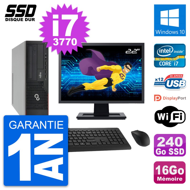 PC Fujitsu E910 DT - Intel Core i7-3770 3.4 Ghz (8 Mo) - 16 Go DDR3 - Disque Dur SSD 240 Go - Graveur DVD - Clef Wifi USB - Windows 10 - Livré avec Ecran 22" + clavier + souris (Marques et modèles variables) - Garantie 1 an.