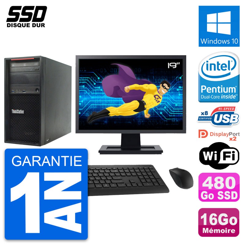 PC Tour Lenovo ThinkStation P300 MT - Intel Pentium G3220 3.0 Ghz (3 Mo) - 16 Go DDR3 - Disque Dur SSD 480 Go - Graveur DVD - Clef Wifi USB - Windows 10 - Livré avec Ecran 19" + clavier + souris (Marques et modèles variables) - Garantie 1 an.