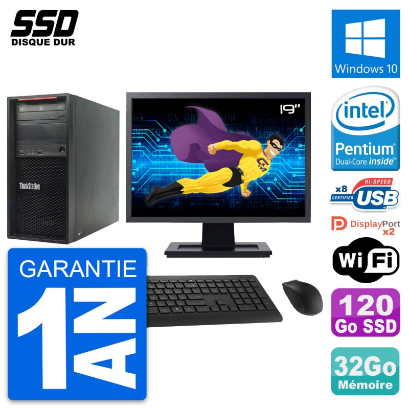 PC Tour Lenovo ThinkStation P300 MT - Intel Pentium G3220 3.0 Ghz (3 Mo) - 32 Go DDR3 - Disque Dur SSD 120 Go - Graveur DVD - Clef Wifi USB - Windows 10 - Livré avec Ecran 19" + clavier + souris (Marques et modèles variables) - Garantie 1 an.