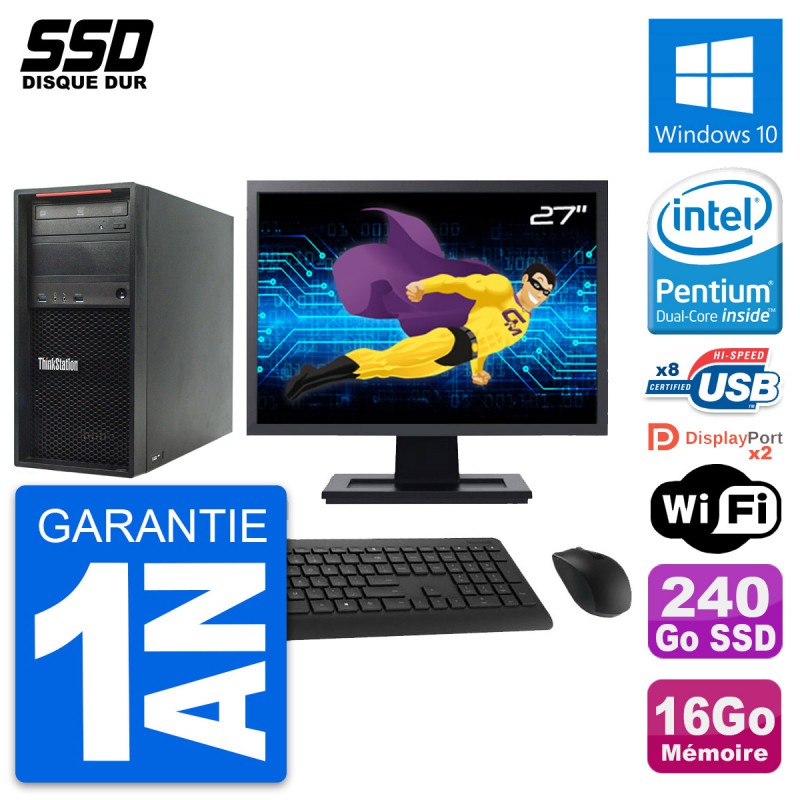 PC Tour Lenovo ThinkStation P300 MT - Intel Pentium G3220 3.0 Ghz (3 Mo) - 16 Go DDR3 - Disque Dur SSD 240 Go - Graveur DVD - Clef Wifi USB - Windows 10 - Livré avec Ecran 27" + clavier + souris (Marques et modèles variables) - Garantie 1 an.