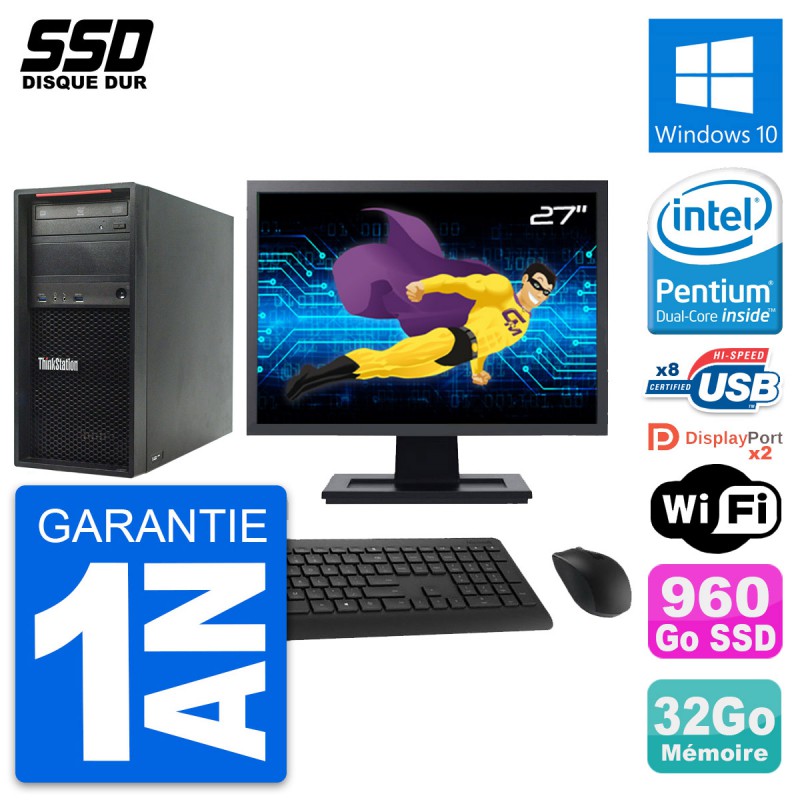 PC Tour Lenovo ThinkStation P300 MT - Intel Pentium G3220 3.0 Ghz (3 Mo) - 32 Go DDR3 - Disque Dur SSD 960 Go - Graveur DVD - Clef Wifi USB - Windows 10 - Livré avec Ecran 27" + clavier + souris (Marques et modèles variables) - Garantie 1 an.