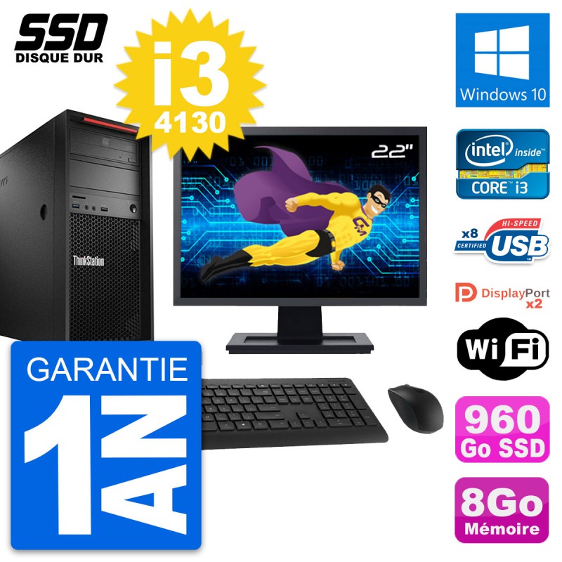PC Tour Lenovo ThinkStation P300 MT - Intel Core i3-4130 3.4 Ghz (3 Mo) - 8 Go DDR3 - Disque Dur SSD 960 Go - Graveur DVD - Clef Wifi USB - Windows 10 - Livré avec Ecran 22" + clavier + souris (Marques et modèles variables) - Garantie 1 an.