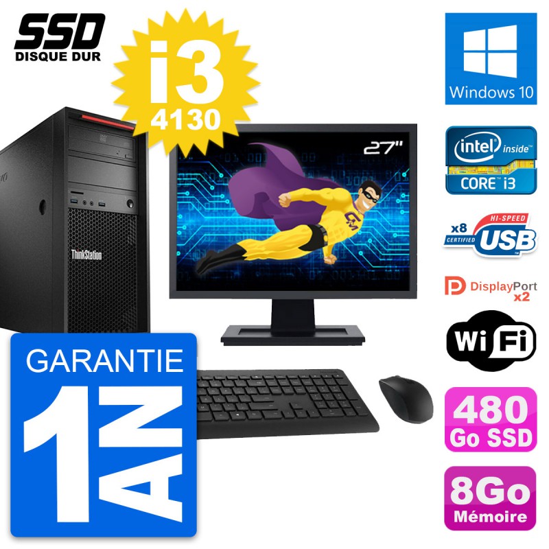 PC Tour Lenovo ThinkStation P300 MT - Intel Core i3-4130 3.4 Ghz (3 Mo) - 8 Go DDR3 - Disque Dur SSD 480 Go - Graveur DVD - Clef Wifi USB - Windows 10 - Livré avec Ecran 27" + clavier + souris (Marques et modèles variables) - Garantie 1 an.
