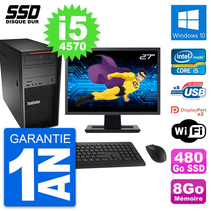 PC Tour Lenovo ThinkStation P300 MT - Intel Core i5-4570 3.2 Ghz (6 Mo) - 8 Go DDR3 - Disque Dur SSD 480 Go - Graveur DVD - Clef Wifi USB - Windows 10 - Livré avec Ecran 27" + clavier + souris (Marques et modèles variables) - Garantie 1 an.