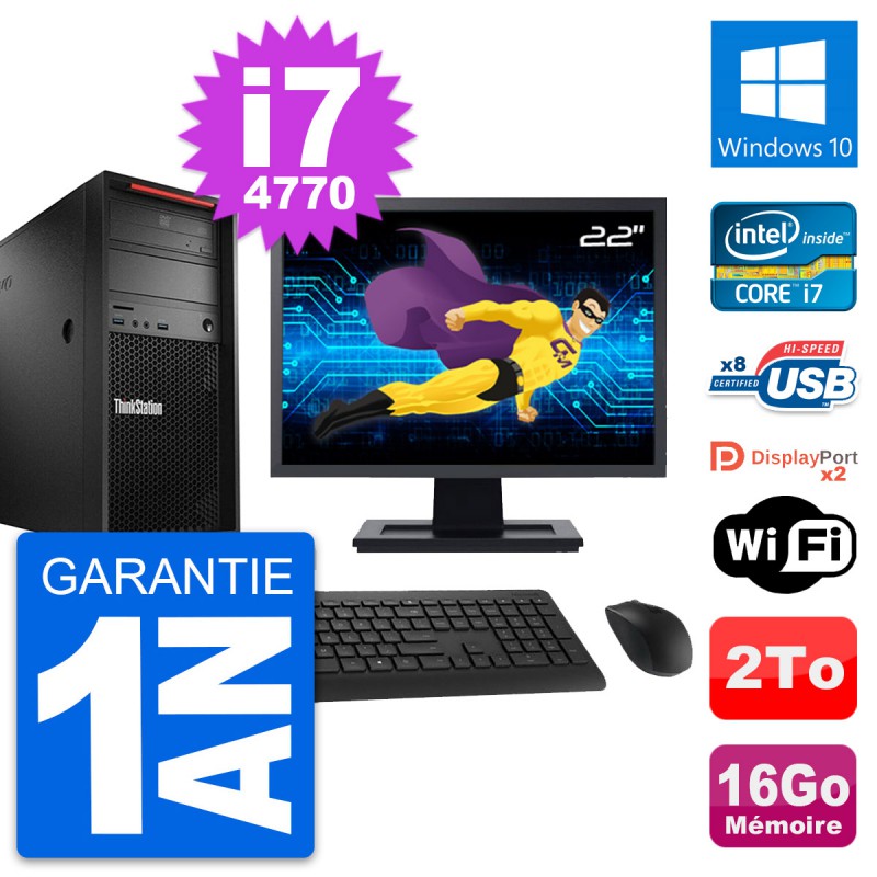 PC Tour Lenovo ThinkStation P300 MT - Intel Core i7-4770 3.4 Ghz (8 Mo) - 16 Go DDR3 - Disque Dur 3,5" 2 To - Graveur DVD - Clef Wifi USB - Windows 10 - Livré avec Ecran 22" + clavier + souris (Marques et modèles variables) - Garantie 1 an.