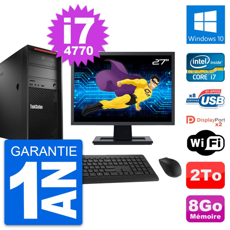 PC Tour Lenovo ThinkStation P300 MT - Intel Core i7-4770 3.4 Ghz (8 Mo) - 8 Go DDR3 - Disque Dur 3,5" 2 To - Graveur DVD - Clef Wifi USB - Windows 10 - Livré avec Ecran 27" + clavier + souris (Marques et modèles variables) - Garantie 1 an.