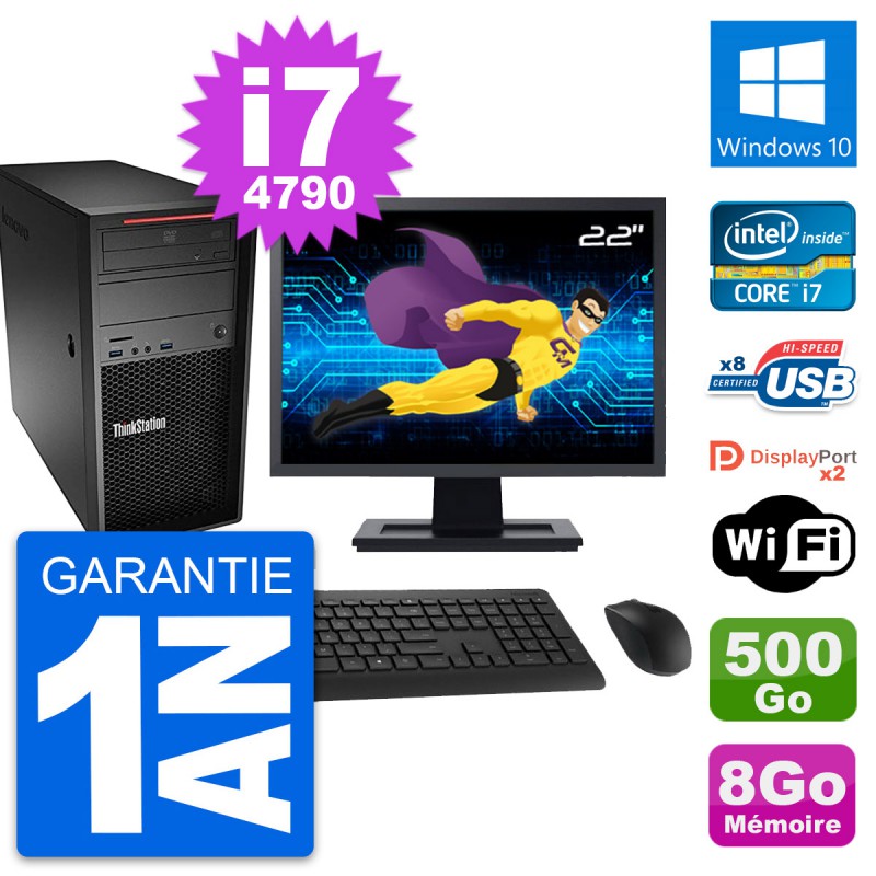 PC Tour Lenovo ThinkStation P300 MT - Intel Core i7-4790 3.6 Ghz (8 Mo) - 8 Go DDR3 - Disque Dur 3,5" 500 Go - Graveur DVD - Clef Wifi USB - Windows 10 - Livré avec Ecran 22" + clavier + souris (Marques et modèles variables) - Garantie 1 an.