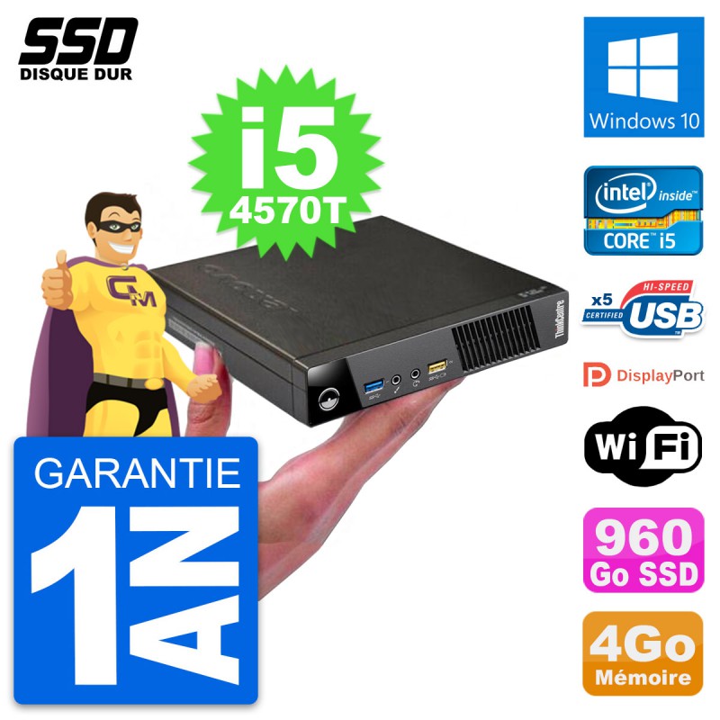 Ultra Mini PC Lenovo M93p Tiny - Intel Core i5-4570T 2.9 Ghz (4 Mo) - 4 Go DDR3 - Disque Dur SSD 960 Go - Clef Wifi USB - Windows 10 - Garantie 1 an.