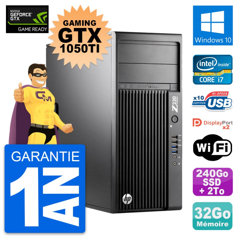 PC Tour Gaming Gamer HP WorkStation Z230 - Intel Core i7-4790 3.6 Ghz (8 Mo) - Nvidia GTX 1050Ti 4Go - 32 Go DDR3 - SSD 240 Go + Disque Dur 2 To - Graveur DVD - Clef Wifi USB - Windows 10 - Garantie 1 an.