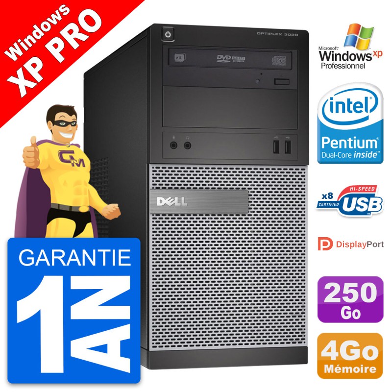 PC Tour Dell OptiPlex 3020 MT - Intel Pentium G3220 3.0 Ghz (3 Mo) - 4 Go DDR3 - Disque Dur 3,5" 250 Go - Graveur DVD - Windows XP Pro - Garantie 1 an.