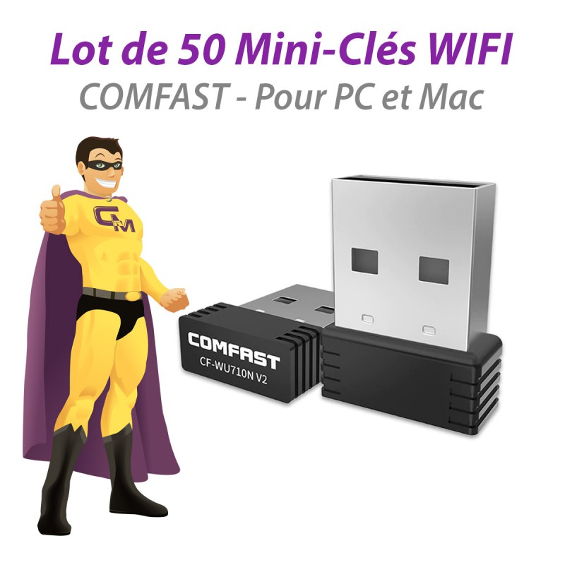 Lot de 50 Mini-Clés WIFI USB 2.0 - COMFAST - Modèle CF-WU710N V2 - Haut-Débit 802.11abgn / 150Mbps / 2.4Ghz - Pour Mac et PC - Etat NEUF - Garanties 12 mois.