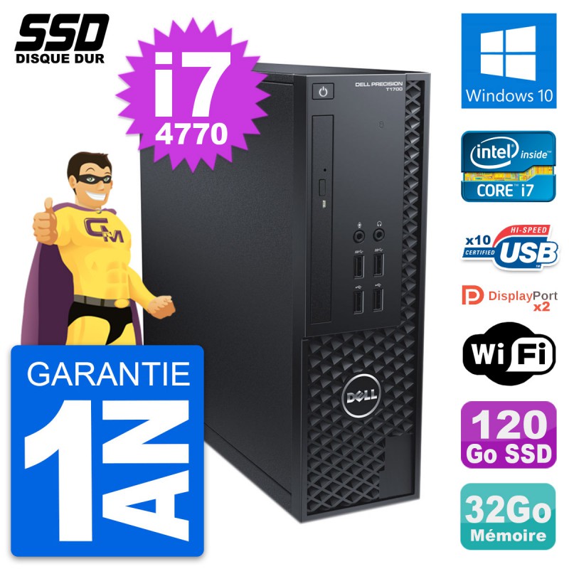 PC Dell Precision T1700 SFF (Slim) - Intel Core i7-4770 3.4 Ghz (8 Mo) - 32 Go DDR3 - SSD 120 Go - Graveur DVD - Clef Wifi USB - Windows 10 - Garantie 1 an.