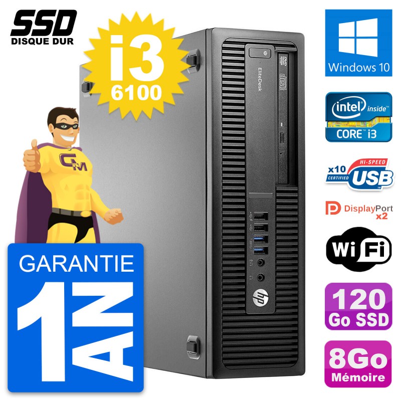 PC HP EliteDesk 800 G2 SFF - Intel Core i3-6100 3.7 Ghz (3 Mo) - 8 Go DDR4 - SSD 120 Go - Graveur DVD - Clef Wifi USB - Windows 10 - Garantie 1 an.