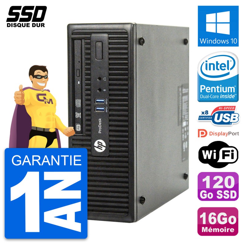 PC HP ProDesk 400 G3 SFF - Intel Pentium Dual-Core G4400 3.3 Ghz (3 Mo) - 16 Go DDR4 - Disque Dur SSD 120 Go - Graveur DVD - Clef Wifi USB - Windows 10 - Garantie 1 an.