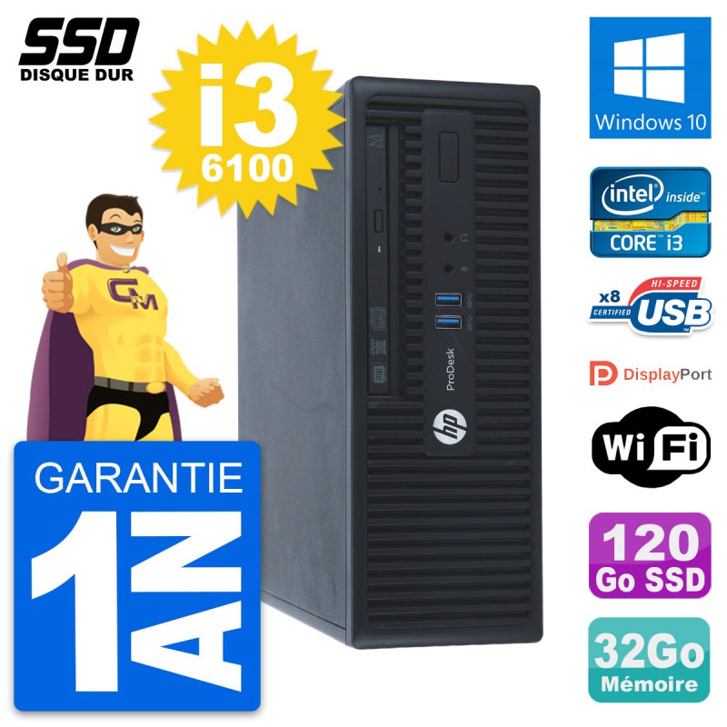 PC HP ProDesk 400 G3 SFF Intel Core i3-6100 RAM 32Go SSD 120Go Windows 10 Wifi