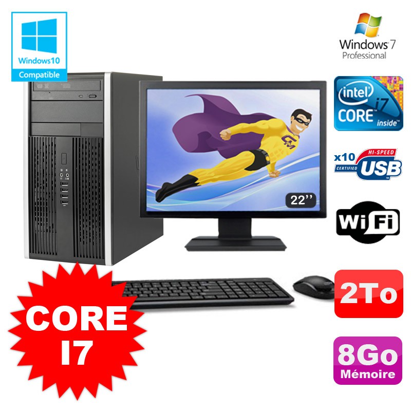 Lot PC Tour HP Elite 8200 Core I7 3,4Ghz 8Go 2To Graveur WIFI W7 + Ecran 22