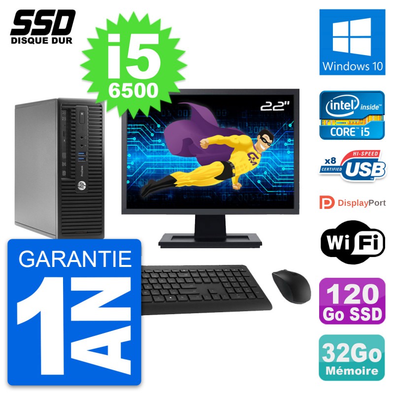 PC HP ProDesk 400 G3 SFF Ecran 22" i5-6500 RAM 32Go SSD 120Go Windows 10 Wifi