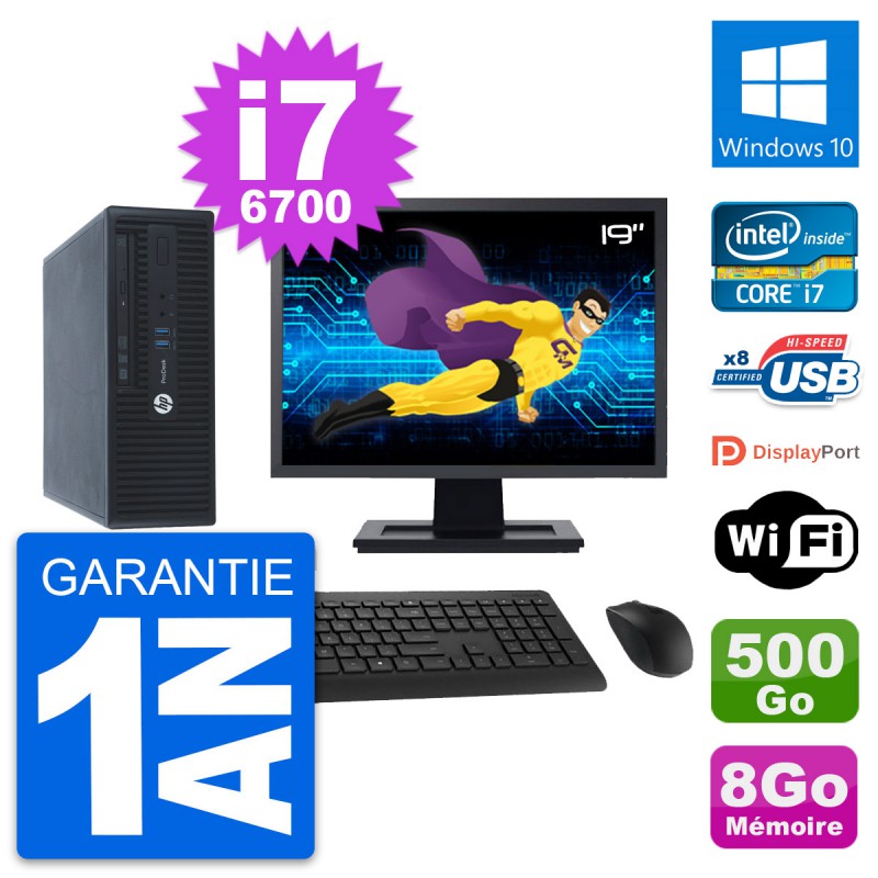 PC HP ProDesk 400 G3 SFF - Intel Core i7-6700 3.4 Ghz (8 Mo) - 8 Go DDR4 - Disque Dur 3,5" 500 Go - Graveur DVD - Clef Wifi USB - Windows 10 - Livré avec Ecran 19" + clavier + souris (Marques et modèles variables) - Garantie 1 an.