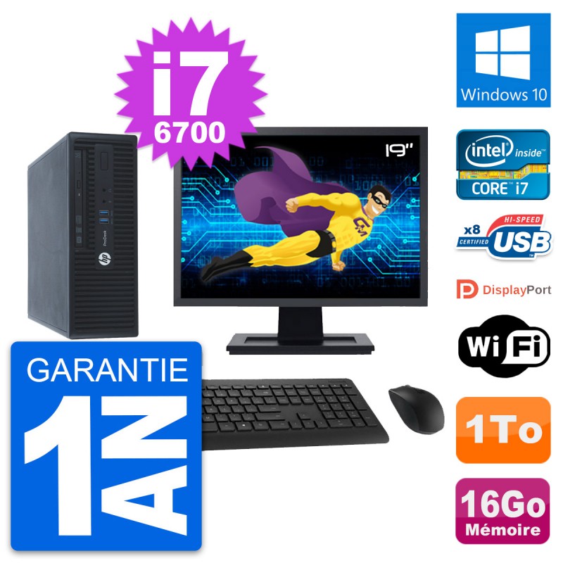 PC HP ProDesk 400 G3 SFF - Intel Core i7-6700 3.4 Ghz (8 Mo) - 16 Go DDR4 - Disque Dur 3,5" 1 To - Graveur DVD - Clef Wifi USB - Windows 10 - Livré avec Ecran 19" + clavier + souris (Marques et modèles variables) - Garantie 1 an.
