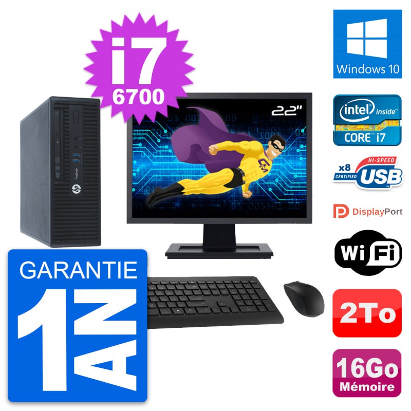 PC HP 400 G3 SFF Ecran 22" Intel i7-6700 RAM 16Go Disque 2To Windows 10 Wifi