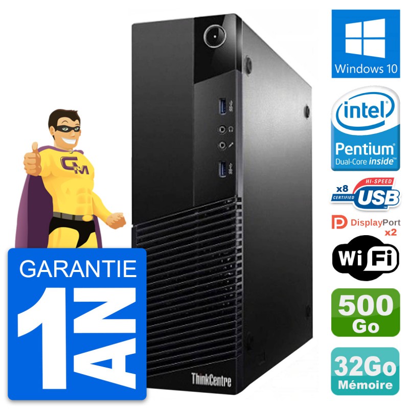 PC Lenovo ThinkCentre M83 SFF - Intel Pentium Dual-Core G3220 3.0 Ghz (3 Mo) - 32 Go DDR3 - Disque Dur 3,5" 500 Go - Clef Wifi USB - Windows 10 - Garantie 1 an.