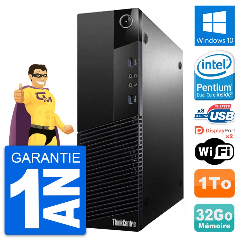 PC Lenovo ThinkCentre M83 SFF - Intel Pentium Dual-Core G3220 3.0 Ghz (3 Mo) - 32 Go DDR3 - Disque Dur 3,5" 1 To - Clef Wifi USB - Windows 10 - Garantie 1 an.