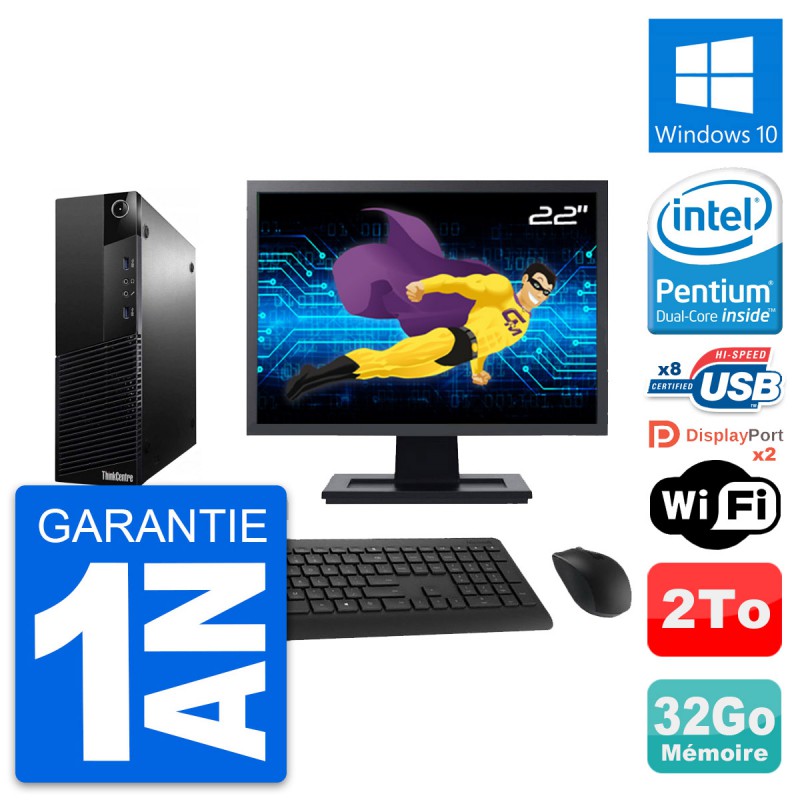 PC Lenovo ThinkCentre M83 SFF - Intel Pentium Dual-Core G3220 3.0 Ghz (3 Mo) - 32 Go DDR3 - Disque Dur 3,5" 2 To - Clef Wifi USB - Windows 10 - Livré avec Ecran 22" + clavier + souris (Marques et modèles variables) - Garantie 1 an.