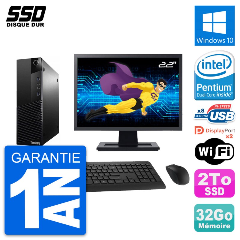 PC Lenovo ThinkCentre M83 SFF - Intel Pentium Dual-Core G3220 3.0 Ghz (3 Mo) - 32 Go DDR3 - SSD 2 To - Clef Wifi USB - Windows 10 - Livré avec Ecran 22" + clavier + souris (Marques et modèles variables) - Garantie 1 an.