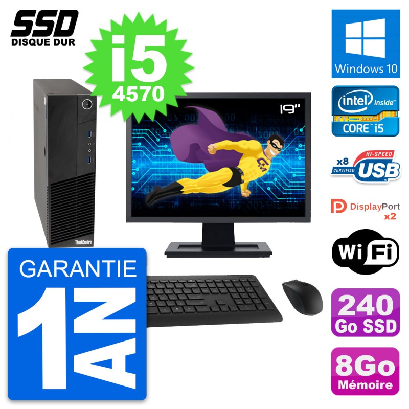 PC Lenovo ThinkCentre M83 SFF - Intel Core i5-4570 3.2 Ghz (6 Mo) - 8 Go DDR3 - SSD 240 Go - Clef Wifi USB - Windows 10 - Livré avec Ecran 19" + clavier + souris (Marques et modèles variables) - Garantie 1 an.