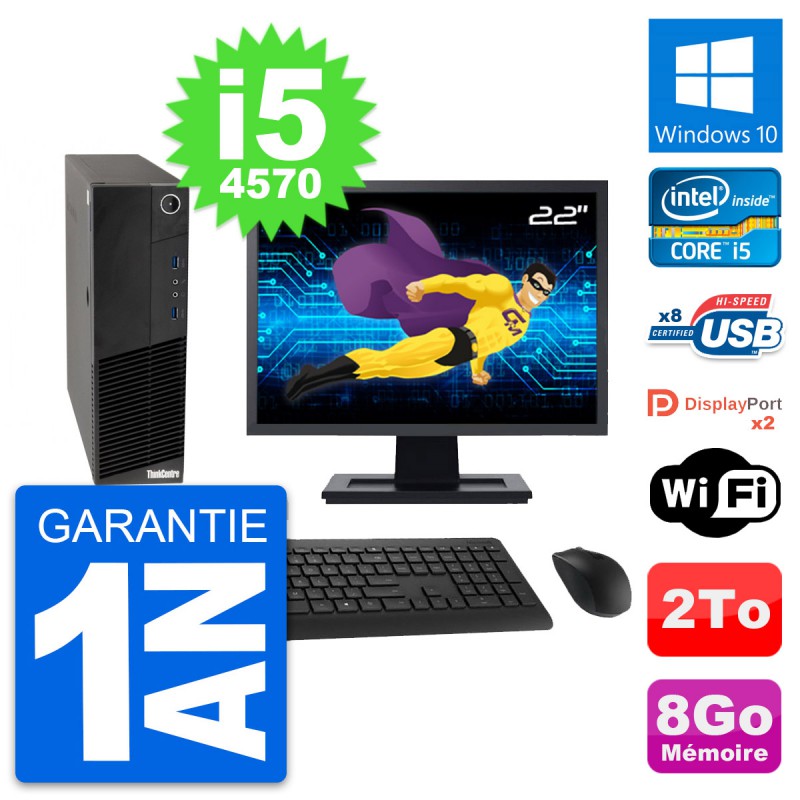 PC Lenovo ThinkCentre M83 SFF - Intel Core i5-4570 3.2 Ghz (6 Mo) - 8 Go DDR3 - Disque Dur 3,5" 2 To - Clef Wifi USB - Windows 10 - Livré avec Ecran 22" + clavier + souris (Marques et modèles variables) - Garantie 1 an.